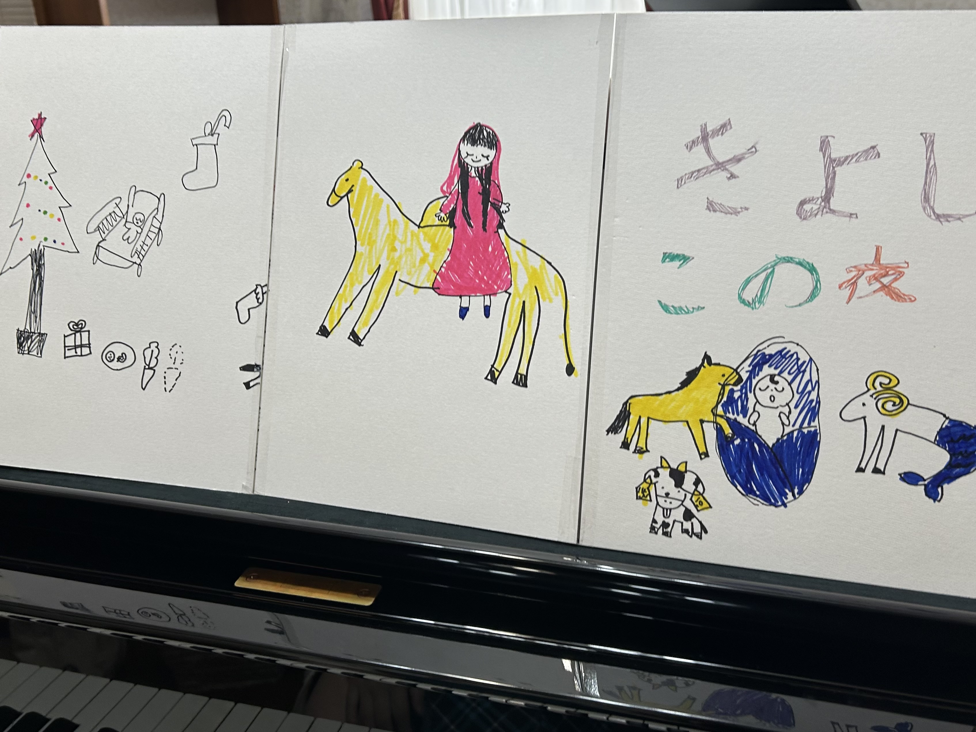 「きよしこの夜」を弾く生徒さんが、曲の世界を心で感じて描いた絵です。音のやさしさ、夜の静けさ、あたたかい光…。一枚一枚に、音楽を聴いて感じた“心の絵”があらわれています。ピアノで表現するだけでなく、感じたことを絵にすることで、音楽の物語を深く味わうレッスンになりました🎄✨