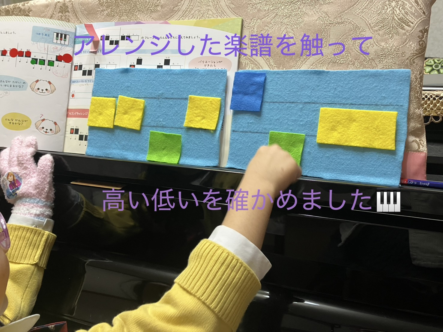 「音に触れる、音楽の時間。✨ 遊びの延長に、大切な学びが詰まってます。「触って学ぶ、音の高さ。フェルトの質感が、音楽をもっと身近にしてくれるね。🎨🎵」